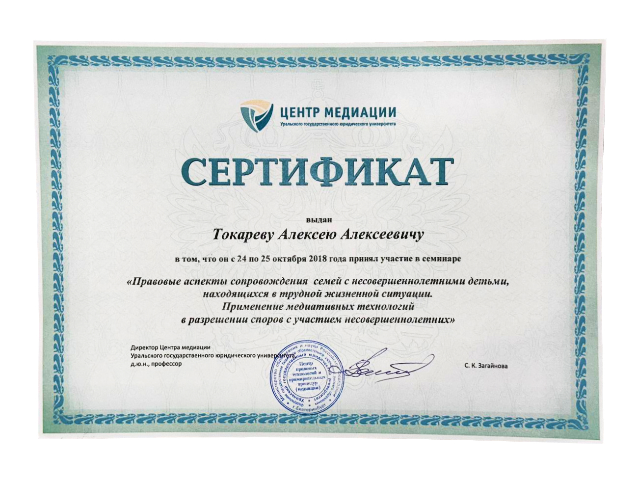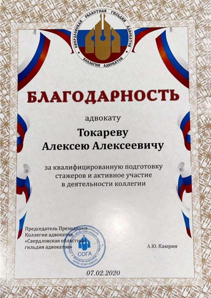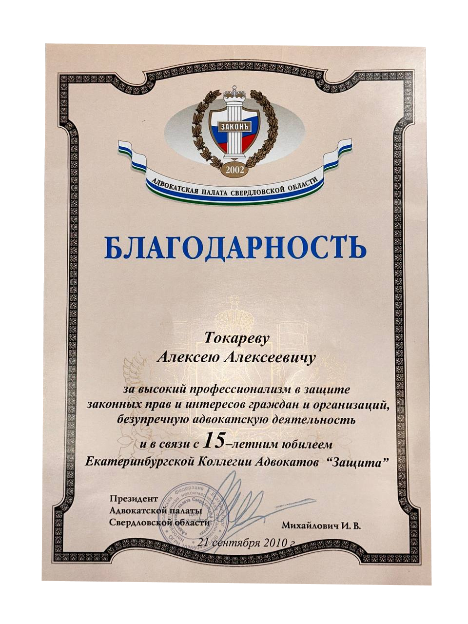 2010г. Благодарностью Адвокатской Палаты Свердловской области