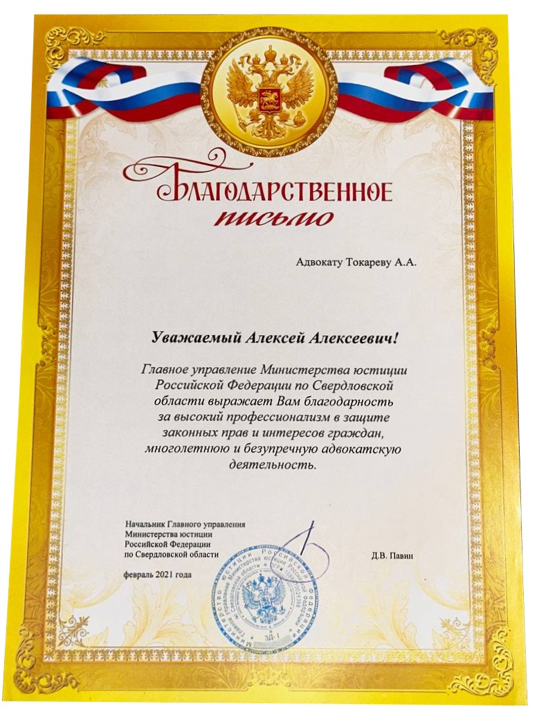 2021г. Благодарностью ГУ Минюста РФ по Свердловской области